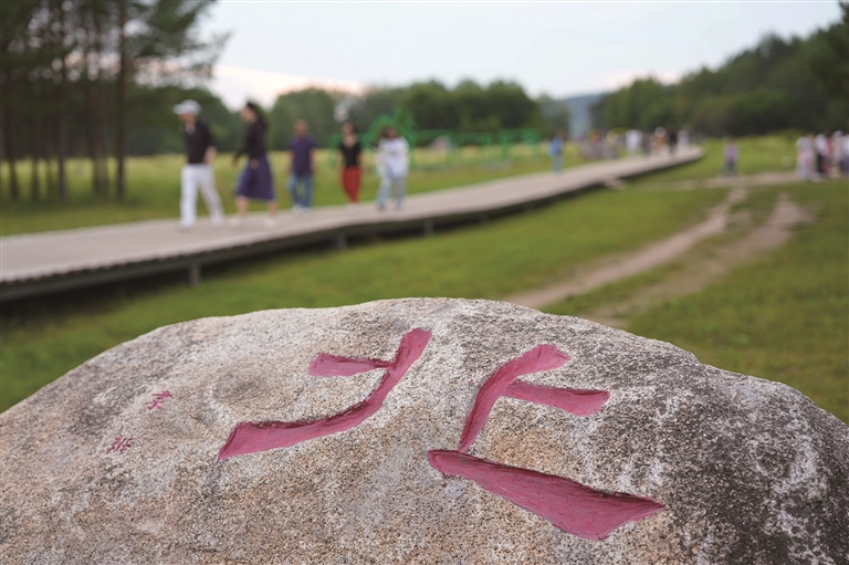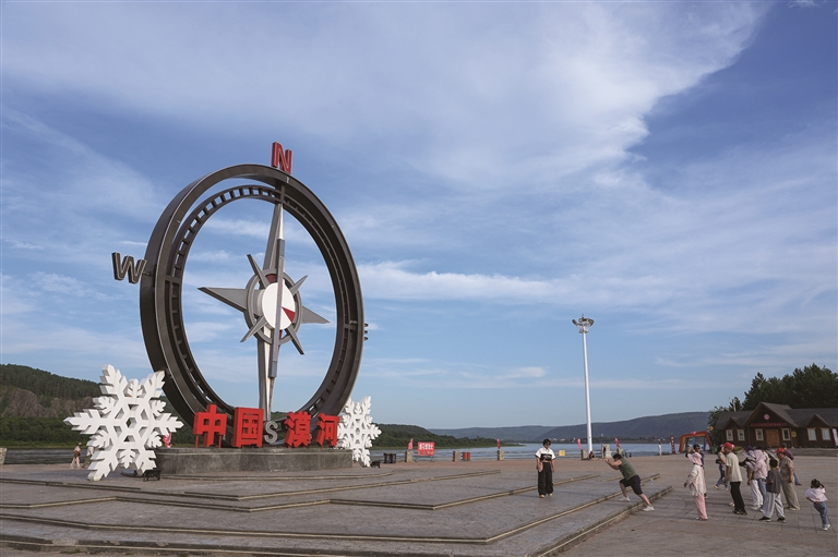 8月7日,游客在漠河市北极村的七星广场游玩、拍照。