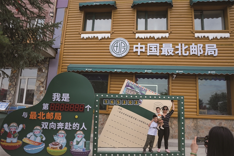 8月8日,游客在位于漠河市北极村的“中国最北邮局”前拍照。