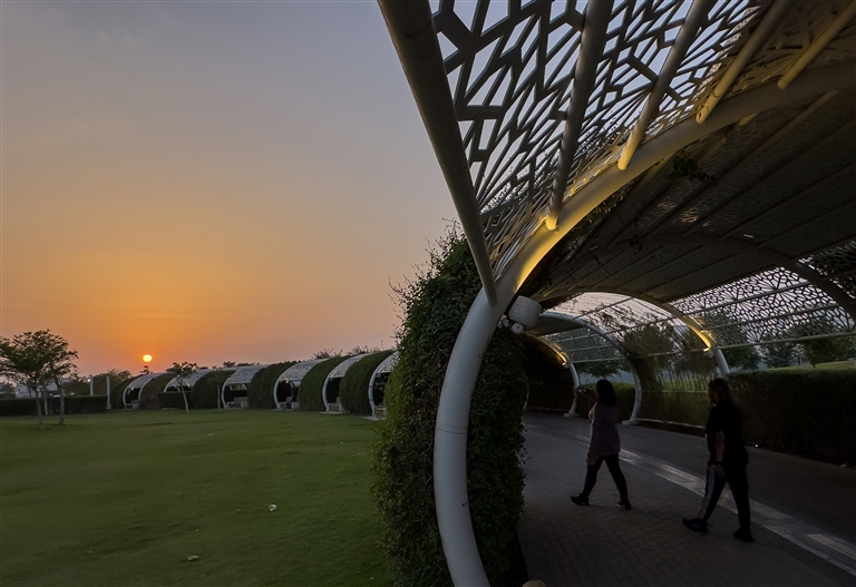 为缓解高温压力,卡塔尔正将“降温”纳入城市发展体系。位于多哈市区的乌姆西尼姆公园是最具代表性的工程之一。该公园拥有户外空调步道,步道地面下隐藏着错综复杂的管网系统,在酷热之下营造出一条清凉通道。不少市民在此散步、锻炼。在滚滚热浪中,乌姆西尼姆公园这样的“清凉绿岛”犹如高温中的避风港。