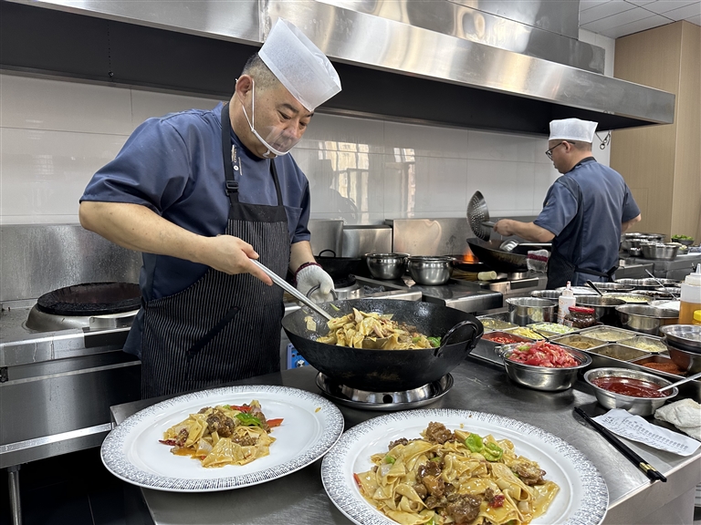 7月29日,临近晌午,王志军正在自己经营的悦馨万豪酒店后厨忙碌着。只见他一边颠勺,一边调味,一套动作行云流水,一气呵成。没一会儿,他的拿手好菜羊肉焖饼便出锅了。