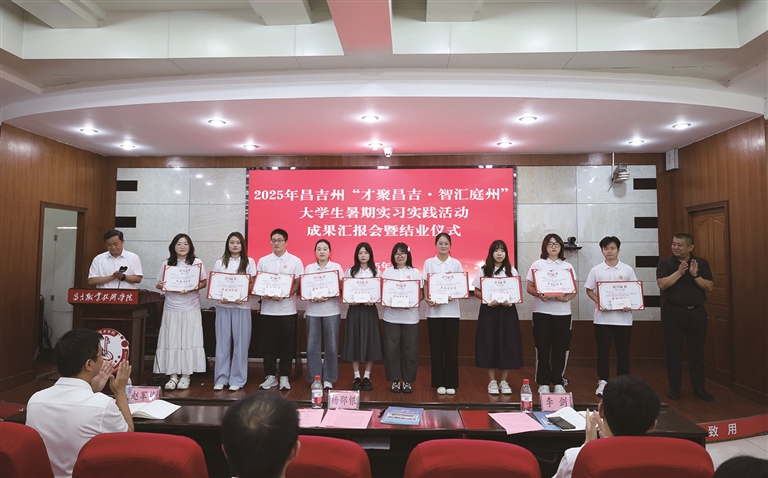 本报讯 记者付小芳报道:8月7日下午,2025年昌吉州“才聚昌吉·智汇庭州”大学生暑期实习实践活动成果汇报会暨结业仪式在昌吉职业技术学院分校区举行,标志着来自国内8所“双一流”高校的50名青年学子为期4周的实习活动圆满结束。