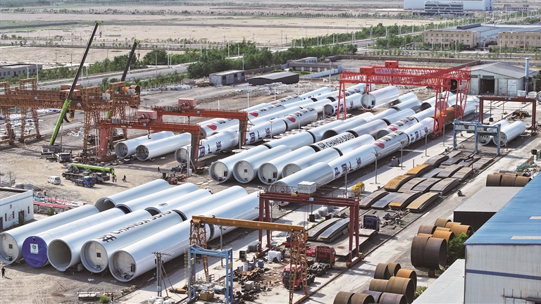在成品堆场,等待运输的货车已排成长龙,满载塔筒的车辆接连驶向戈壁深处的风电项目。“同期订单量同比增长20%,目前6万吨的产能已排至10月份。”钟维华表示,每一套塔筒都连接着项目节点,公司将全面提升工效、抢进度,确保订单按期交付。
