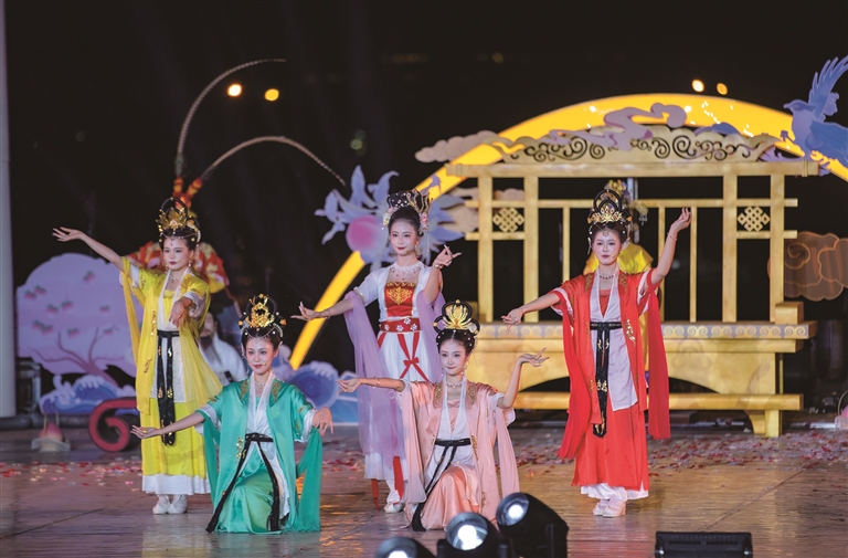 8月8日,新疆·西王母瑶池蟠桃会在阜康市举行。活动现场,正在表演情景剧《王母宴群仙》。