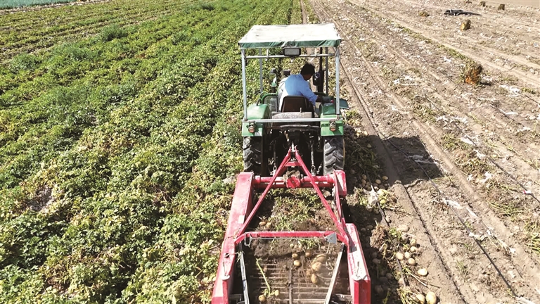 在玛纳斯县兰州湾镇王家庄村的土豆种植基地里,农机手驾驶收获机采收土豆。□赵善宾摄