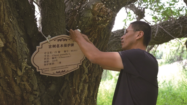 近日,木垒县林业和草原局的工作人员为古树悬挂古树名木保护牌。□王昆仑 摄