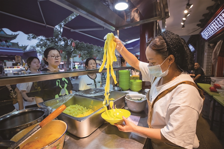 8月18日,昌吉小吃街,凉皮摊前的游客络绎不绝。□本报记者 巨海成摄