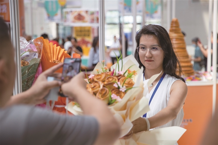8月15日,2025新疆舌尖上的丝绸之路美食节暨昌吉州美食文化旅游节活动现场,商家把馕做成花束。□本报记者 巨海成摄