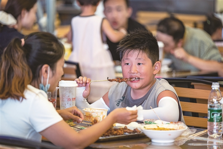 8月13日,夜晚的昌吉小吃街,游客大快朵颐。□本报记者 何 龙摄