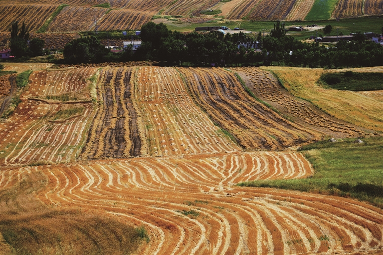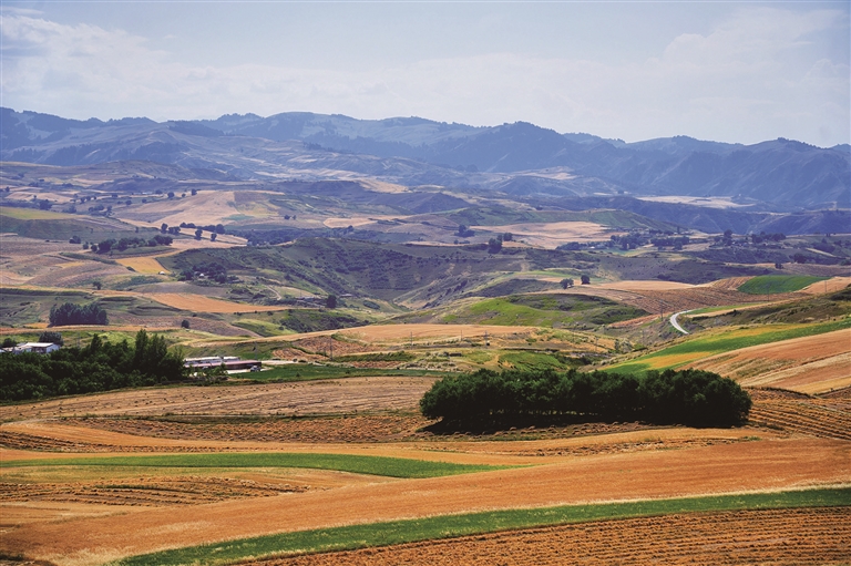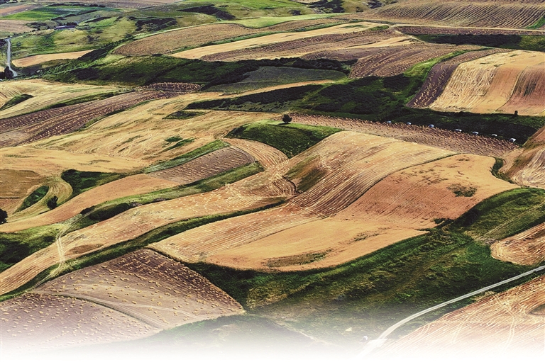 俯瞰木垒中国农业公园,麦田与牧草黄绿相间。