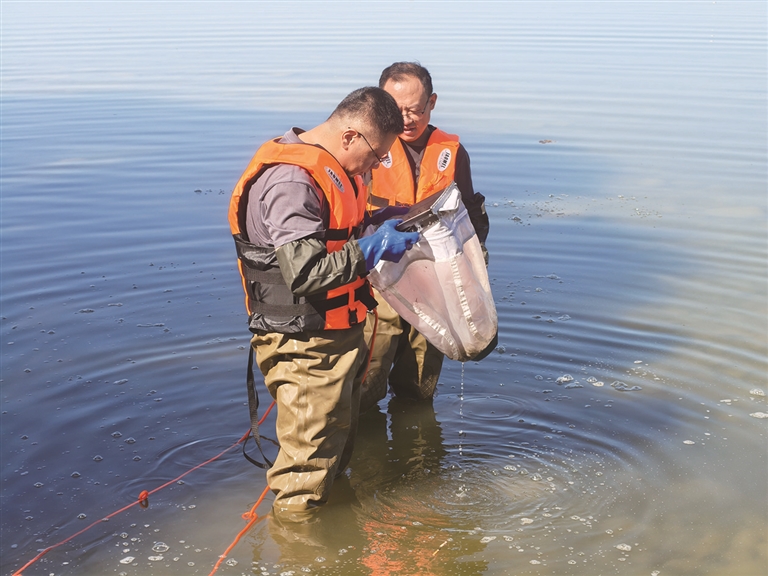 8月26日,活动现场,昌吉生态环境监测站的工作人员下水捕捞水生生物,用以此次监测活动。□马冬菲摄