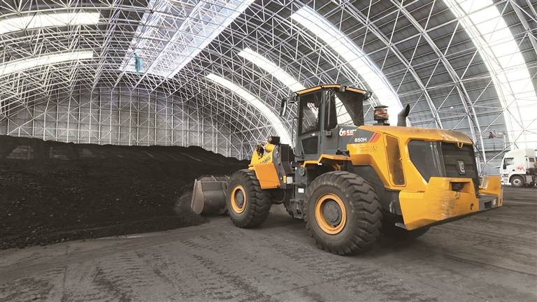 近日,在木垒春晖供热有限责任公司储煤库内,工作人员驾驶铲车有序堆放新运抵的燃煤。□石 倩摄