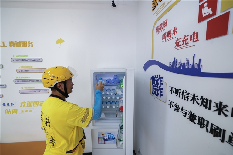 8月26日,外卖骑手在嘉兴南湖区的24小时工会驿站(嘉工驿站工商银行站)的冰箱内取用免费的矿泉水。