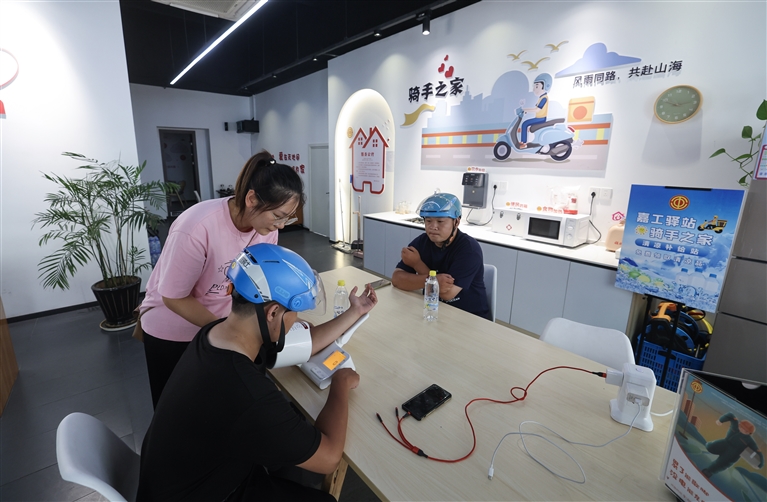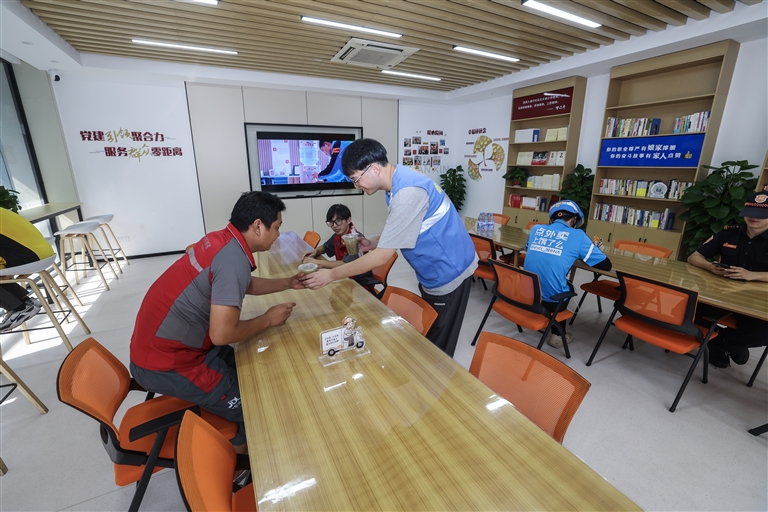 8月26日,嘉兴市南湖区工会志愿者(右二)在工会驿站(嘉工驿站工商银行站)为休息的外卖骑手送上绿豆汤等清凉饮品。
