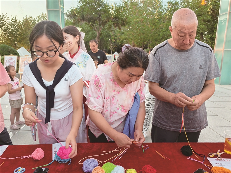 当天,游客赵女士带着孙女来参加活动,看着孩子捏针时笨拙却专注的模样,不禁感慨:“现在的孩子,很少有机会接触针线了。我们小时候,每到七夕,女孩子都要穿针乞巧。如今年轻人不经常用针线了,但这份耐心和用心,值得我们一代代传下去。”她一边说,一边轻轻握住孙女的小手,带着她完成最后的打结。