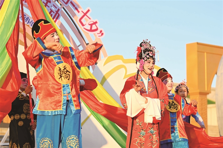 8月28日,昌吉市“天山为证 七夕长情”“我们的节日·七夕”民俗文化嘉年华文明实践活动在新疆大剧院广场举行。 这是戏曲《抬花轿》演出现场,演员身着艳丽的戏服,迈着灵动的台步,通过细腻的表演和活泼的唱腔,将剧中人物的情感与性格展现得淋漓尽致。 □本报记者 何 龙摄