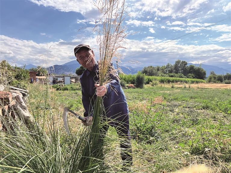 近日,在大有镇广泉下村田间地头,王友胜在收集符合制作扫帚要求的芨芨草。