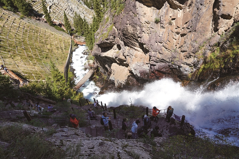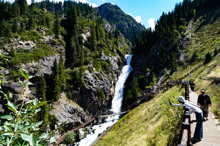 8月26日,天山天池景区东小天池风景栈道,游客沿着木栈道前往景区深处。