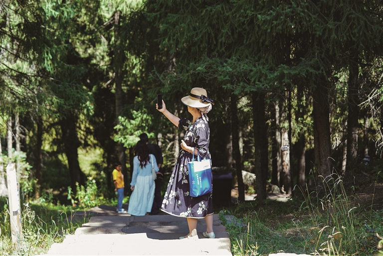 8月26日,游客在天山天池景区游湖栈道上打卡拍照。