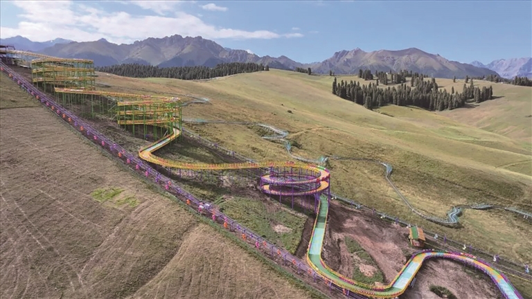 走进江布拉克欢乐谷,欢笑声此起彼伏,孩子们在旋转木马、海盗船等游乐设施上尽情玩耍;年轻人则热衷于体验管轨式滑道、新西兰滑板车等刺激项目。今年,景区新增滑翔伞、热气球等低空飞行项目,新上1760米长的新西兰滑板车滑道,吸引大量游客前来打卡。这条依山而建的滑道,让游客在感受速度与激情的同时,还能俯瞰万亩麦田景色。