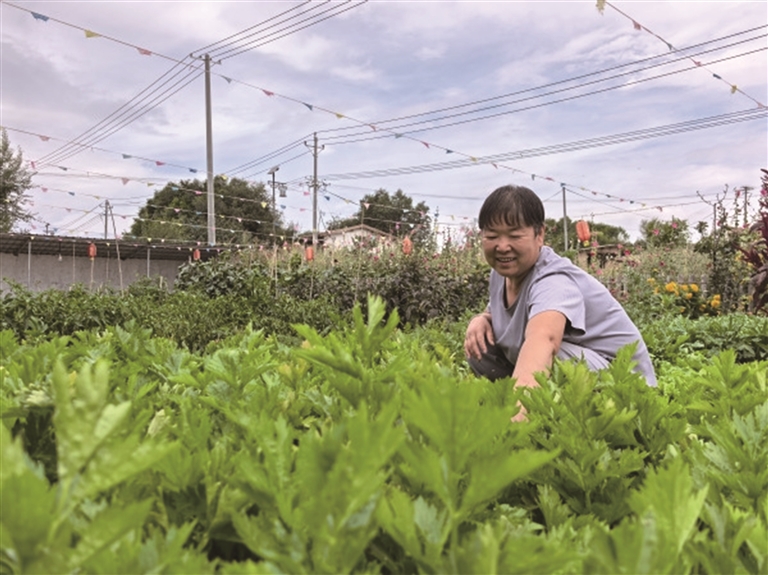 木垒县照壁山乡平顶山村“闲来居”民宿负责人徐建萍察看菜园蔬菜长势。