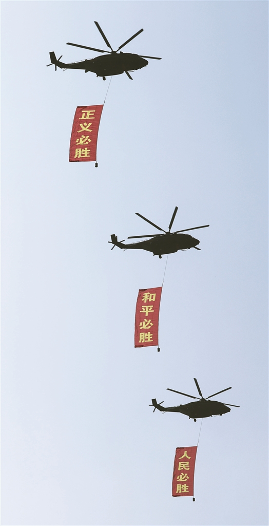9月3日,纪念中国人民抗日战争暨世界反法西斯战争胜利80周年大会在北京隆重举行。这是空中护旗梯队通过天安门广场,3架直-8L运输直升机分别悬挂“正义必胜”“和平必胜”“人民必胜”条幅。□新华社记者 李 钢摄