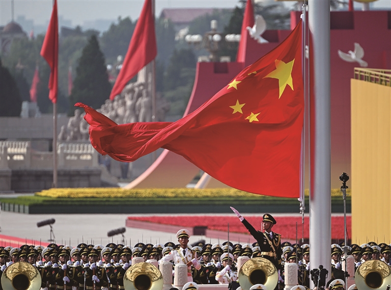 9月3日,纪念中国人民抗日战争暨世界反法西斯战争胜利80周年大会在北京隆重举行。这是天安门广场举行隆重的升国旗仪式。□新华社记者 夏一方摄