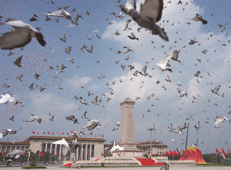 9月3日,纪念中国人民抗日战争暨世界反法西斯战争胜利80周年大会在北京隆重举行。这是纪念大会现场放飞鸽子。