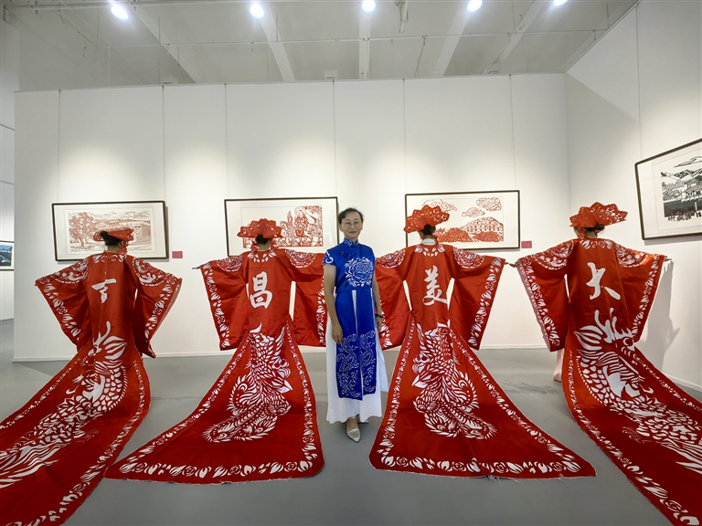 9月1日,“剪刻同心·籽籽连心”昌吉州铸牢中华民族共同体意识剪纸展在昌吉州文联展厅开展。图为剪纸服装展示。