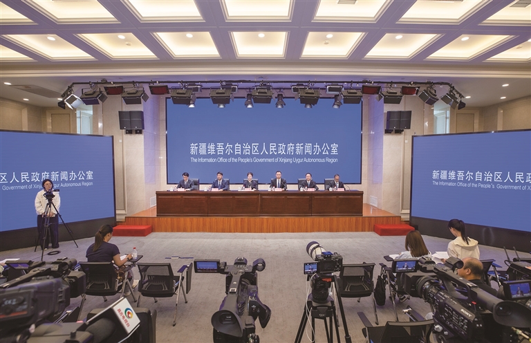 9月10日,自治区人民政府新闻办公室“新时代党的治疆方略的成功实践”系列主题新闻发布会(昌吉州专场)在乌鲁木齐举行。图为新闻发布会现场。□本报记者 巨海成摄