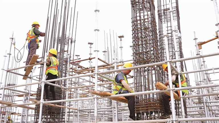 芨芨湖学校建设施工现场,工人们正忙碌地绑扎钢筋。□毕金录摄