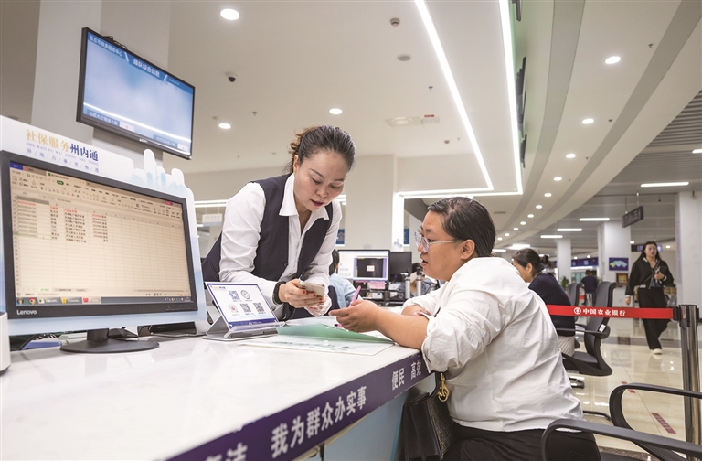 9月10日,昌吉政务服务中心,昌吉市民在工作人员的指导下办理社保业务。 此前,自治区以“先试点、后推广”的方式,稳步推进社保经办“区域内通办”改革,昌吉州被确定为全疆首批试点地区。目前,昌吉市已实现55项社保服务“全州通办”、29项业务线下“兵地通办”,彻底打破了疆内的地域壁垒,打通了社保经办服务“最后一公里”。 □本报记者 何 龙摄