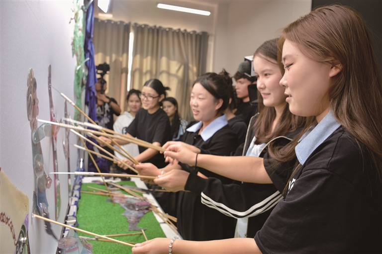 新疆农业职业技术大学广播电视与数字媒体学院学生体验操纵皮影。