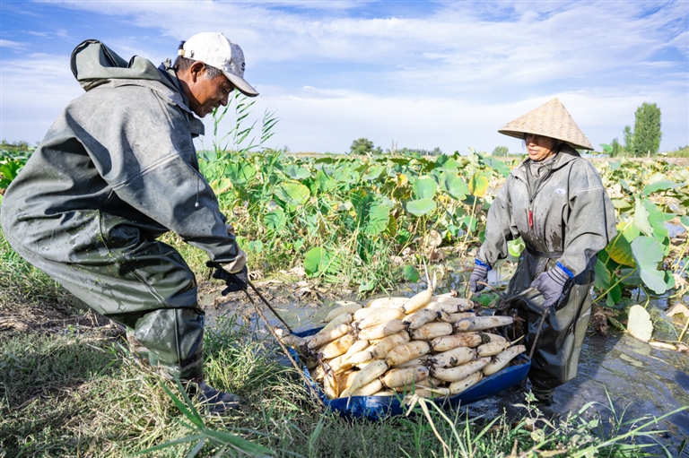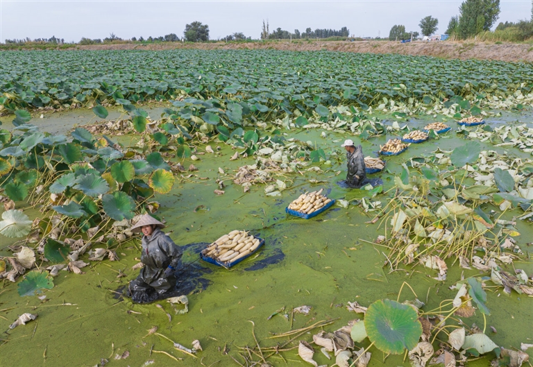 近年来,昌吉市滨湖镇迎丰村积极发展特色种植业,该村将闲置鱼塘成功改造为莲田,打造出一片规模化白莲藕种植基地。采藕季节,丰收的美景吸引四方游客前来观光打卡。