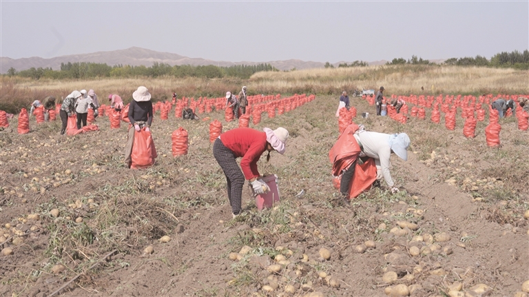 图为玛纳斯县金土豆产供销专业合作社组织人力加紧采收。