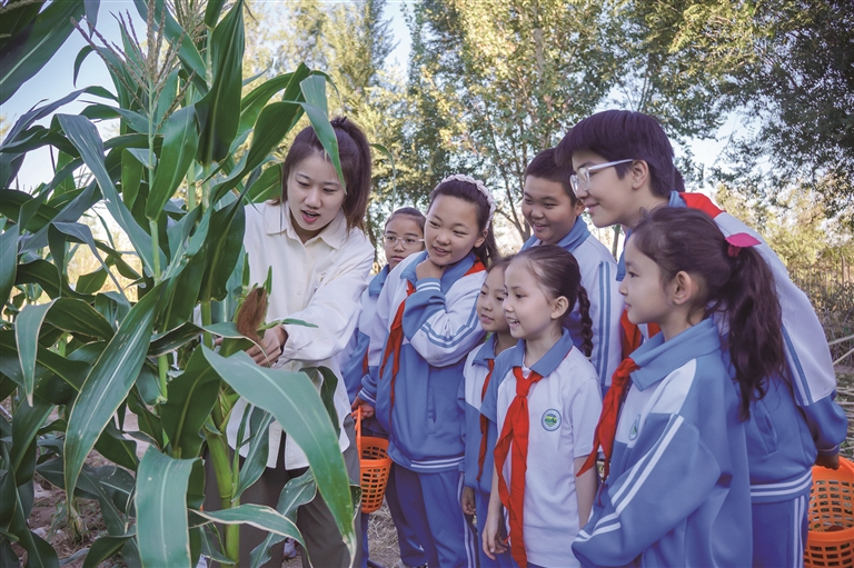 9月22日,在昌吉市第十三小学的校园劳动实践教育基地,老师正在为学生讲解玉米的种植过程。