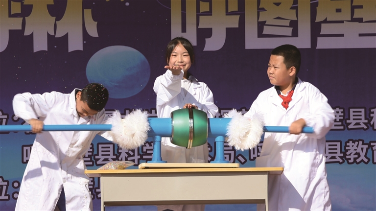 第二届“闽呼杯”呼图壁县青少年科技节上,呼图壁县第一小学学生展示科学实验。□张晓雪摄