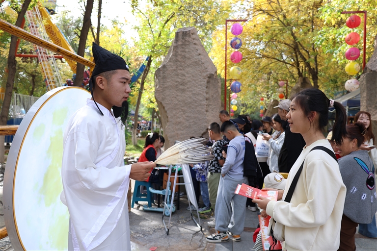秋阳和煦,金桂飘香。10月1日,昌吉市人民公园内洋溢着欢乐祥和的节日气氛,一场融合文艺演出、互动体验、文化传承的大型“沉浸式”庆国庆迎中秋游园活动在此启幕。其中,“盛唐风华·诗月共赏”区域尤为引人注目,12位身着唐装的学生化身李白、杜甫、王维等诗人,与游人谈笑风生、吟诗作对。