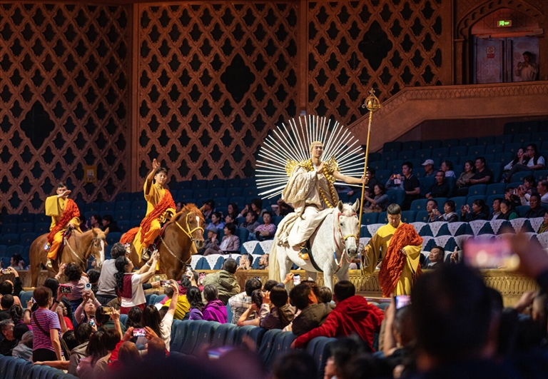 10月2日,新疆大剧院,观众“沉浸式”观看大型室内实景民族歌舞秀《千回西域》。□本报记者 何 龙摄