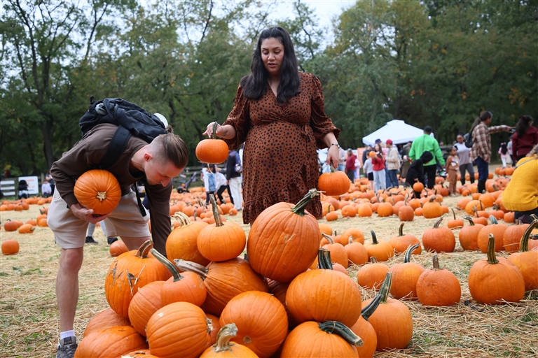 10月11日,人们在美国纽约南瓜集市上挑选南瓜。