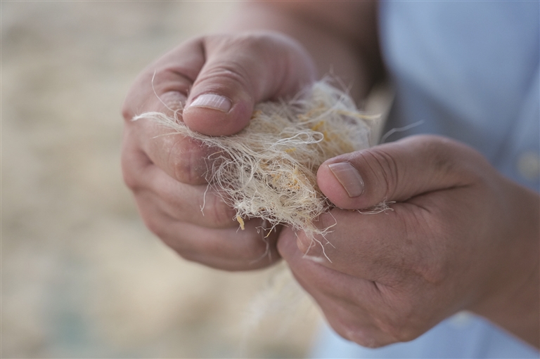 9月20日,在新疆尉犁一家服装公司的罗布麻纤维脱胶车间,工人查看脱胶漂白后的产品品质。