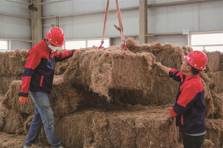 9月20日,在新疆尉犁一家服装公司的罗布麻纤维脱胶车间,工人吊送原材料。