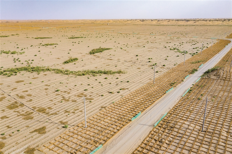 新疆尉犁县境内的塔里木河南岸防沙治沙区的罗布麻种植区(左)和固沙草方格(右)(无人机照片,9月20日摄)。□新华社记者 陈 朔摄