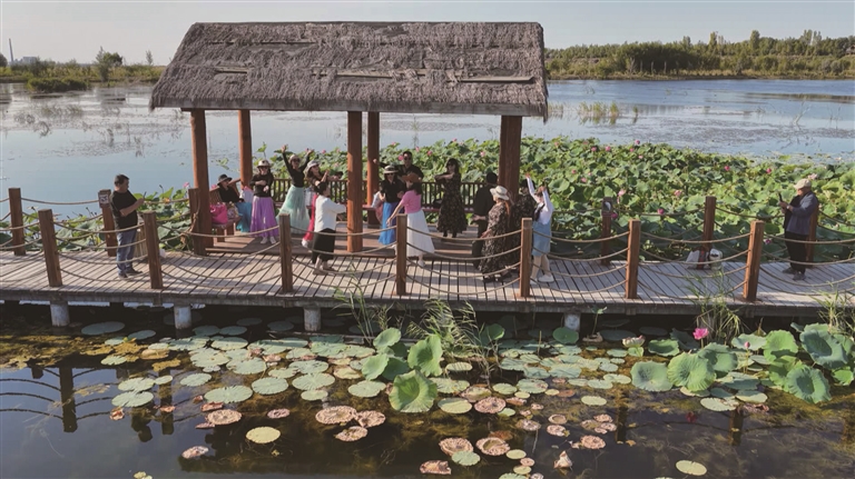近日,游客在玛纳斯国家湿地公园荷花池边翩翩起舞,与美景同乐。 □胡伟杰摄