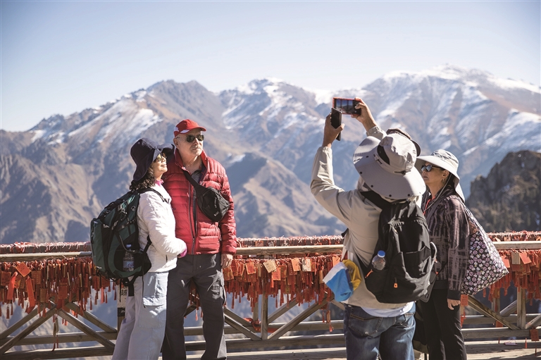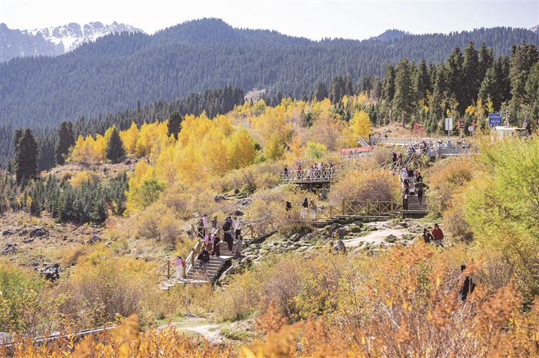 10月1日,游客在阜康市天山天池景区拍照打卡。