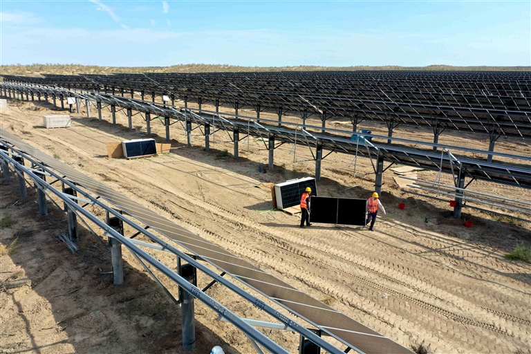 近日,易事特集团昌吉市北沙窝30万千瓦光储一体化低碳园区转型新能源项目现场,工人正加紧安装光伏支架和组件。
