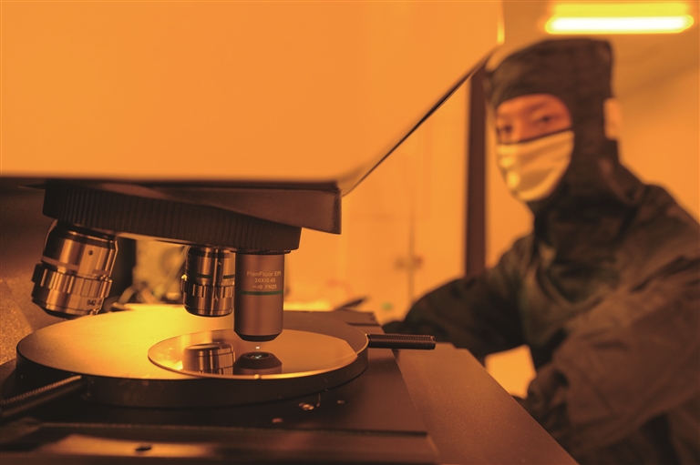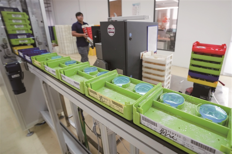 工作人员在诺瞳奕目光学科技(丹阳)有限公司黄光车间内对镜片进行质检(9月26日摄)。□新华社记者 李 博摄