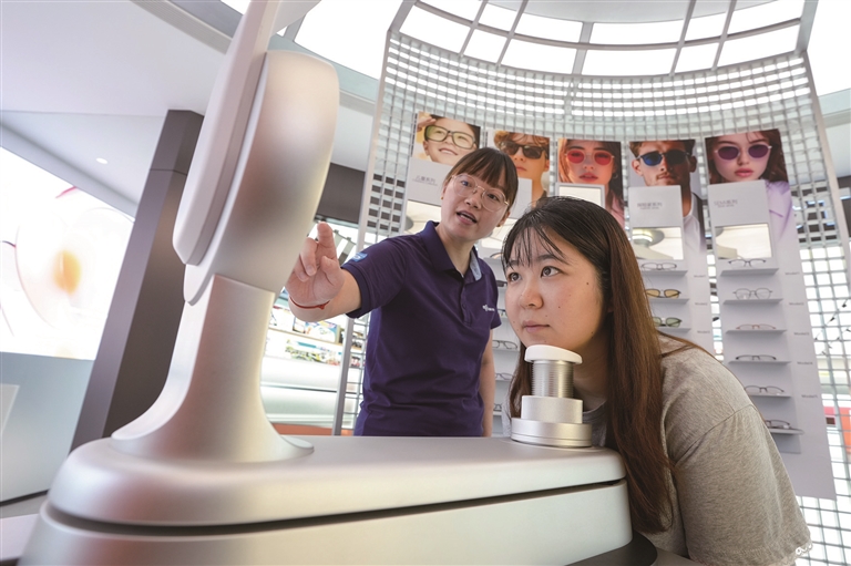 在江苏丹阳一家眼镜店内,消费者使用3D面部扫描制作专属镜框(9月26日摄)。