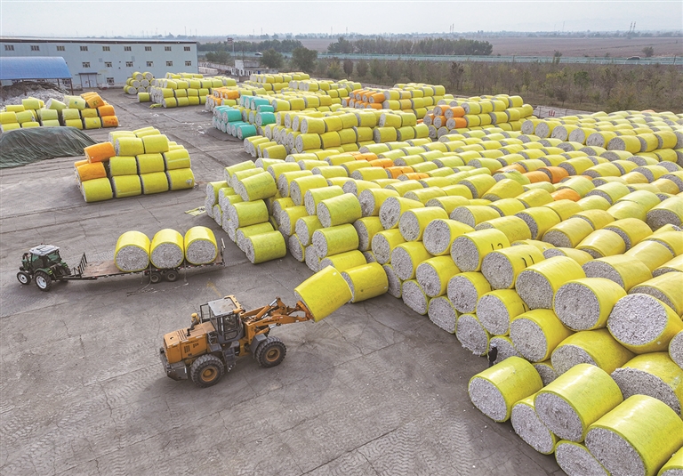 10月13日,玛纳斯县银田棉业有限公司乐土驿轧花厂,铲车在摆放棉包。金秋十月,昌吉州近300万亩棉田迎来丰收,陆续进入采收期,机械化收获率达100%,预计总产突破145万吨。目前,全州425台采棉机已调配至各县市、园区,全力确保朵絮归仓。 □本报记者 何 龙摄