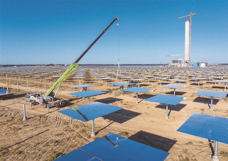 10月8日,鲁能阜康市多能互补项目10万千瓦光热工程建设现场。该项目采用“板上聚光发电、板下生态修复”的荒漠治理模式,向荒漠要效益。