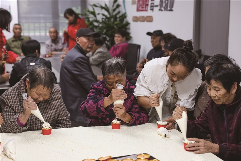 10月21日,志愿者在教老人制作纸杯蛋糕。